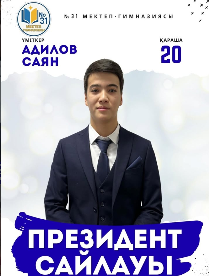 Сайлауға барлығы 1491 сайлаушы қатысты. Сайлау қорытындысы бойынша №31 мектеп-гимназиясының жаңа Президенті 10 “Е” сынып оқушысы Адилов Саян болып сайланды.